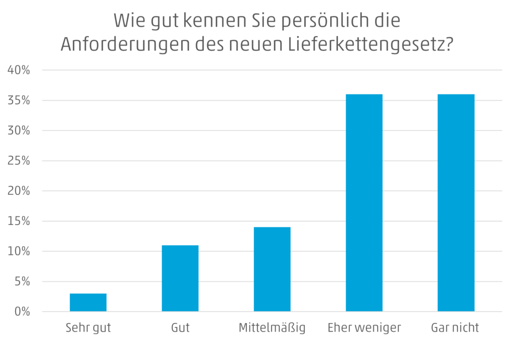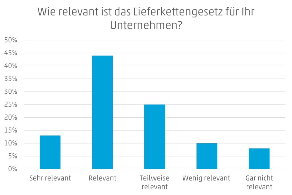 Gleichzeitig gaben jedoch mit 57% mehr als die Hälfte der befragten Unternehmen an, dass das Gesetz relevant bis sehr relevant für das eigene Unternehmen ist. Somit zeigt sich ein sehr großer Nachholbedarf, Informationen und Kenntnisse zu gewinnen.