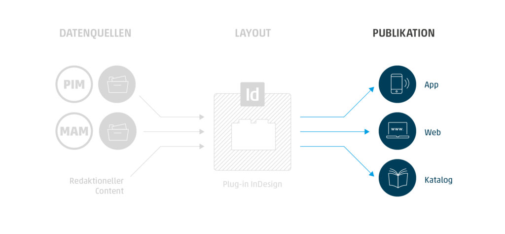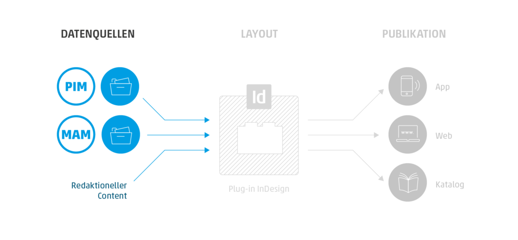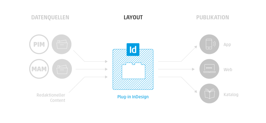 Für das Zusammenspiel der Datenbank und dem Layoutprogramm sorgt ein Plugin, das für die technische Verbindung der beiden Systeme zuständig ist.