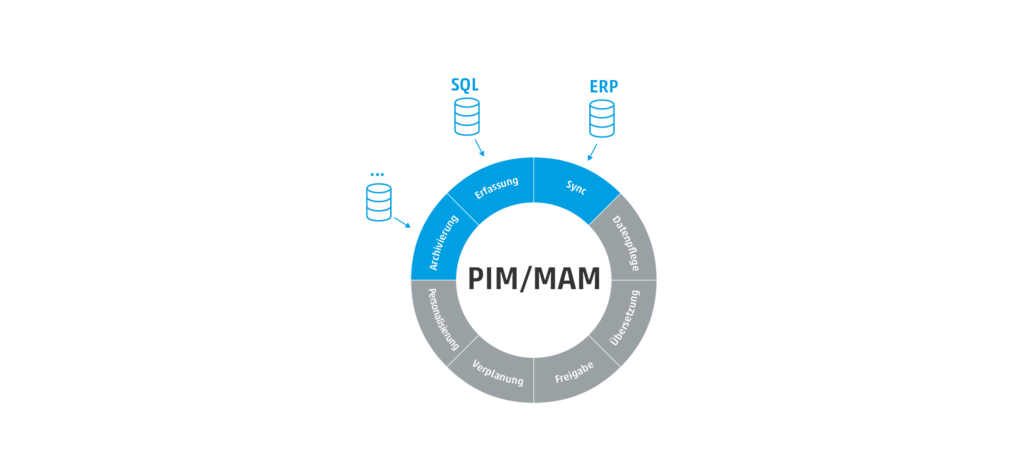Aus den unterschiedlichsten Quellen wie Beispielsweise einem ERP-, Lieferanten- oder Translation Management-System, werden Daten im PIM-System erfasst, synchronisiert und archiviert.