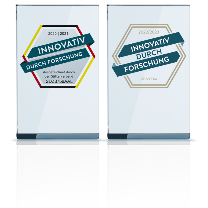 Vom Stifterverband, der im Auftrag des Bundesministeriums für Bildung und Forschung (BMBF) als einzige Institution die Forschungs- und Entwicklungsaktivitäten der deutschen Wirtschaft detailliert erhebt, haben wir das Gütesiegel „Innovativ durch Forschung“ erhalten.